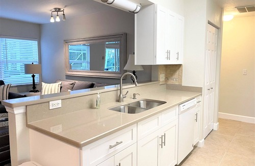 The home features an open and airy floor plan. The living room features comfortable furnishings and a beautiful granite fireplace for those rare cool evenings. The bright sunny family room (with 55' flat panel TV/cable) is open to a large covered outdoor living area with additional dining table/chairs and comfortable seating area over looking a beautiful pool within a private setting. The galley kitchen, newly remodeled with white shaker cabinets and quartz counter tops, is open to the family room and dining area with a view of activity in the pool and outdoor living area.