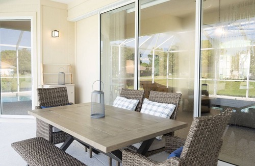 Outside, you will relax in style with a large, heated pool with covered lanai, family size table and chairs, and lounge chairs to soak in the sun. Behind that you will find a man-made, freshwater canal where you can watch the Florida wildlife or throw a line in the water and enjoy some fishing.