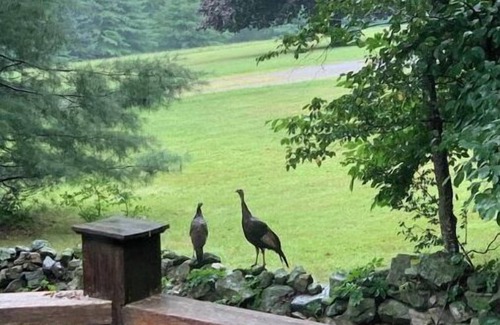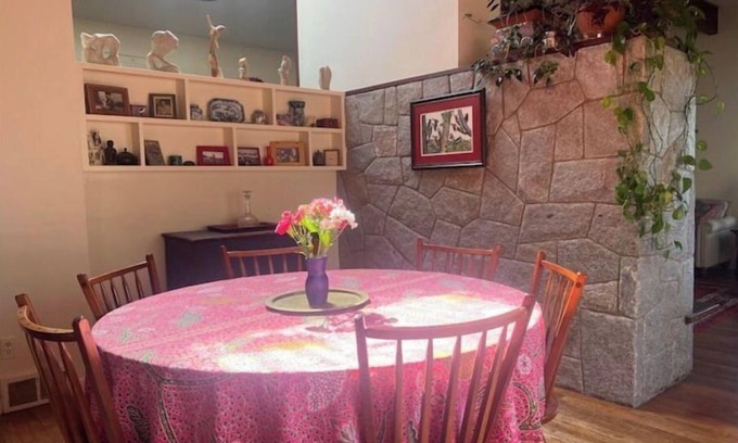 High ceilings and tall trees keep rooms cool all summer. Airy bedrooms, open floor space with large living room, stone fireplace, dining room with sliding doors onto deck, and country kitchen. Plenty of closet space. Balcony provides outdoor dining and comfortable reclining. Large private deck facing wooded hill is great for BBQs.
