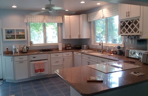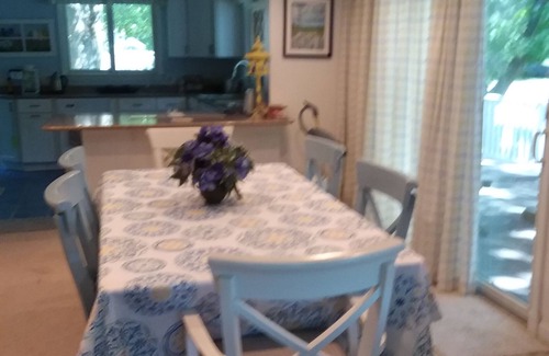 Interior remodeled/upgraded a few years ago. Bright living area incorporates: living room with two sofas and a recliner, TV with basic cable, VCR player and video collection; dining area which opens onto side deck; and a modern kitchen with silestone counter-tops, single oven, fully stocked with dishes and utensils, including toaster, coffee maker, electric kettle. Two modest sized bedrooms. Master with queen bed and sliding double doors opening directly onto front porch. Ensuite bathroom with shower and jetted soaking tub. Second bedroom with queen bed and connected bathroom with shower. Laundry room with washer and dryer. Grill (gas)on deck for use by guests, Private pool open Memorial Day thru Labor Day. Includes a portable Fire pit near private dock that has a bench to watch the wild life and sunsets.