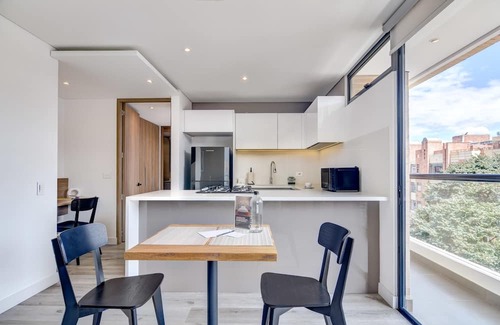 This cozy apartment features one bedroom with a comfortable queen-size bed, a private balcony, high-speed internet, a fully equipped kitchen, and one and a half bathrooms. Designed for two guests, it offers the perfect balance of comfort and convenience for your stay in Bogotá.