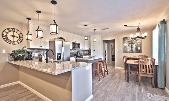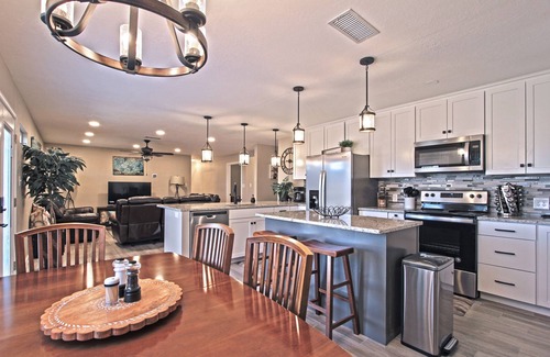 Simply a wonderful remodeled ranch style home nestled on top of the 15 acre oasis estate. The interior is fully remodeled with an open kitchen, granite countertops, stainless steel appliances, kitchen island, pantry and breakfast bar, 56 inch flat screen tv in living room, reclining leather couches and refrigerated air. Home features 6 bedrooms, four which have their own bathrooms and a fifth community 3/4 bathroom with walk-in shower. The oversized master suite includes its own sitting area, office work space, bay windows, walk-in closet and separate entrance. Overall, we have 3 king beds, 1 queen, and 4 twin beds. Comfortable setting for 12 guests. Each bedroom also includes satellite tv and high speed 100mb/s wifi internet. Enjoy the open backyard with propane barbecue grill and six person patio table with additional chairs provided. You may also enjoy sitting upfront under the covered patio with additional seating.