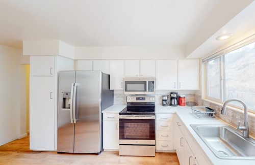This home away from home has a welcoming and bright living room with impressive views of Reno and the mountains. Unwind with your loved ones, plan your next adventures, or simply enjoy a tranquil evening streaming your favorite shows and movies on the smart TV with streaming services. If you are a wintertime visitor, the wood-burning fireplace will keep you nice and toasty during your stay. Discover a well-appointed kitchen with brand-new appliances and cabinets, a convenient dining table, and three coffee makers to please all coffee enthusiasts in your group. Both bedrooms are located upstairs. Additional perks include access to a shared laundry and free WiFi.