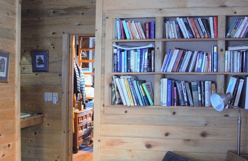 This is not a traditional offering: The cabin has a serene ambiance, with a view, under the pines, a BBQ pit for cooking, a "sheepherder" wood stove for heating & cooking; solar for lighting.1 1/2 baths with shower; water from a spring and a sleeping loft for 2 and a bedroom for 2. Could sleep 6.