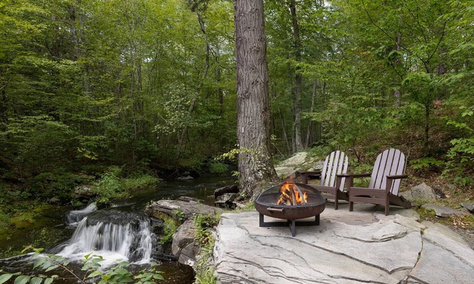 Deep in a lush oak forest, on the bank of Bushkill Creek sits this hidden oasis. This is simply THEE most private abode in the entire area. Situated just feet from the water, the falls can be seen and heard from every room within the cabin’s charming, rustic interior. This spectacular 45 acre parcel is set within a vast reserve of state land: an oasis within an oasis. Just 90 minutes from NYC, this is a truly sublime atmosphere, perfect for those seeking a rejuvenating and inspiring getaway.