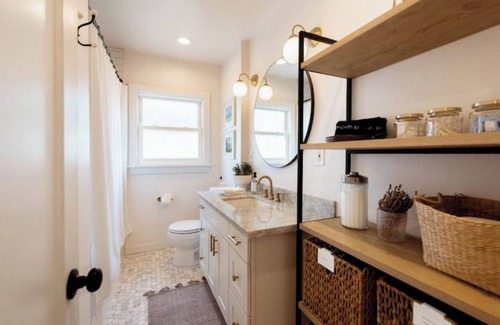 Our bathroom is bright and airy with a tub & shower combo, a large round mirror and plush towels. The bathroom is upstairs next to Bedroom 1 & 2. To make your stay even more comfortable, we provide these toiletries for you: shampoo, conditioner, body wash, cotton rounds, q-tips and makeup wipes.