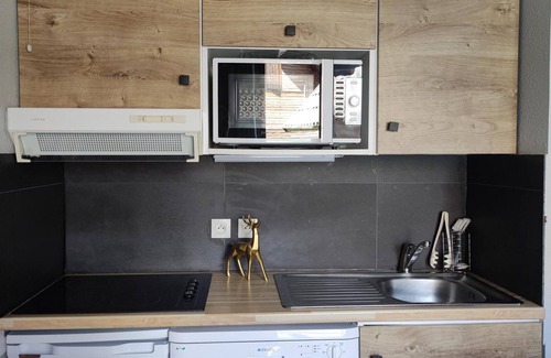 Coin cuisine équipée avec plaques vitro-céramiques, hotte aspirante, réfrigérateur, micro-ondes, lave-vaisselle, cafetière à filtre, bouilloire, grille-pain, machine à raclette, crêpière, nécessaire de vaisselle, aspirateur.