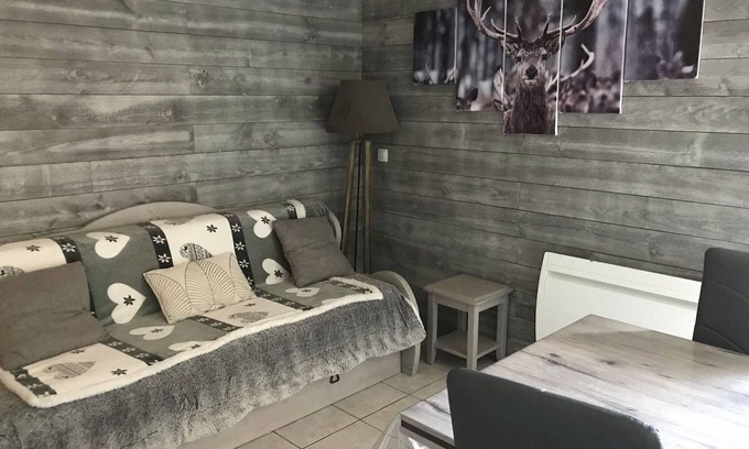 Renovated chalet 7 pers, 2 rooms, parking, pets allowed is located in La Joue du Loup. Renovated chalet 7 pers, 2 rooms, parking, pets allowed provides accommodation, featuring Balcony/Terrace, Security/Safety, Fireplace/Heating, among other amenities. This Ski Chalet features Balcony/Terrace, Security/Safety, Fireplace/Heating, to make your stay a comfortable one.