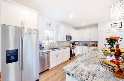 Thoughtful updates have expanded the home's footprint to 2,900 square feet. The elegant kitchen anchors the main level, offering stainless steel appliances (including a wine fridge and a dishwasher), a large island with bar seating, and a country dining table. For movie or game nights, gather in the living room or the cozy den, both with TVs.