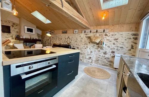 You enter directly into a spacious living room (35 m²) with a fully equipped kitchen (induction hob, oven, refrigerator with freezer compartment, dishwasher, washing machine) opening onto the living room with its dining area (table, chairs, sideboard) and lounge area (sofa bed, coffee table, armchairs, flat-screen TV). Wi-Fi access is available.
