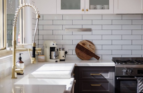 Kitchen: The kitchen is spacious and well-equipped. It has ample storage and bench space, a 6-burner gas cooker/oven, a Nespresso coffee pod machine, a milk frother, a microwave, a kettle, a toaster, a double door fridge with a freezer, and timber flooring.