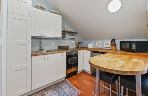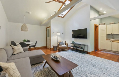 On the second floor you will find a large sectional which pulls out to a queen bed. The living room features a Smart TV and spacious window seat. The dining area seats four guests and can also double as an additional work space. The full kitchen contains Microwave, toaster, coffee maker, small fridge, oven and cook top. A portable dishwasher is available and a full sized fridge is located in the garage.