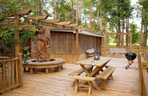 The appeal of the cedar boarded Colorado-styled cabin begins with a front porch with a swing, and a huge wood deck which features a swing and comfortable rocking chairs, and a spectacular view of the four acre fishing pond and natural surroundings. The cabin includes air conditioning and heating systems for the comfort of all guests. The main bedroom features two queen beds, while a smaller bedroom has a bunk bed, ideal for the younger family members (you have to walk through the main bedroom to get to the bunk room). A guest can enjoy the extra large lounge chairs while watching a variety of videos on the flat screen television. The kitchen offers a full sized stove, oven and microwave. Guests are reminded that fish frying and crawfish boiling is restricted to the outdoor area. Smoking inside the cabin is strictly prohibited.