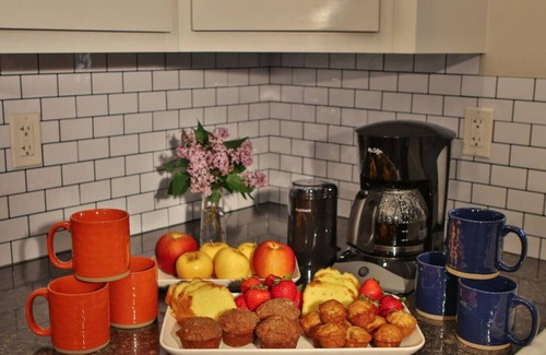 The private fully-fenced backyard has a covered patio, perfect for outdoor dining and lounging. Sit in the comfy Adirondack chairs around the fire pit and listen to Russell Creek and multiple bird songs.