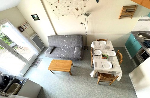 Accommodation: Located 200m from the sea and dunes, this pleasant holiday home rental includes a kitchenette equipped with fridge freezer and microwave, a living room with TV and sofa, a bedroom with 1 double bed, a mezzanine with 2 single beds, a bathroom with washing machine and a toilet, quiet environment.The Plus of this seafront rental: secured and heated swimming pool, tennis courts, enclosed garden with terrace, garden furniture and deckchairs, private parking.Household end of stay included. This property enjoys a furnished 1-star tourism classification.