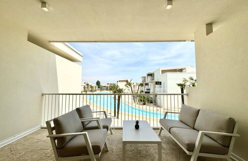 The first floor apartment welcomes you with a spacious living room and a fully equipped kitchen, along with a comfortable double sofa bed. You will find a bedroom with double bed and a second room with two single beds. The terrace furnished with become and table, offering a panoramic view of the pool and palm trees. Finally, the bathroom is equipped with a modern shower for your comfort. Parking included in the price. Tourist tax to be paid at check-in.