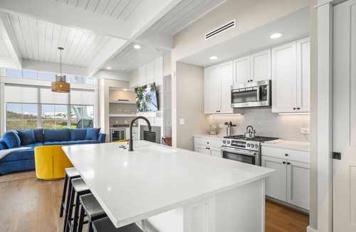 Step inside to discover opulent finishes, plush furnishings, and cheerful hues that make it feel like a vacation. You'll immediately notice the large windows that fill Sea'n Stars with sunshine. Cozy club chairs and a comfortable chaise sectional center around the large Smart TV. Craft your favorite cocktail or uncork a bottle of perfect-temperature white at the dry bar, grab the remote, relax back and enjoy a favorite movie together.