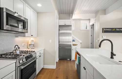 When you aren't out on the town savoring a delicious seafood dinner at one of Port A's notable restaurants, you'll have Sea'n Stars' stylish kitchen right at your fingertips. Designed with high-end stainless-steel appliances, a gas range and a working kitchen island, you'll have everything you need to prepare your favorite dishes...all you need to bring along are the ingredients! Pull up a barstool to the kitchen island's counter or head outside for an Alfresco dinner experience under a colorful Texas sunset.