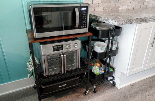 The kitchen is also wheelchair accessible. Cabinet bases have pull-out drawers with high toe-kicks and open bases under the sink and cook-top. Counter-top appliances are conveniently located on a rolling cart and include a multi-function oven, microwave oven, and electric grill. The full-size refrigerator has a bottom freezer with pull-out drawers.
