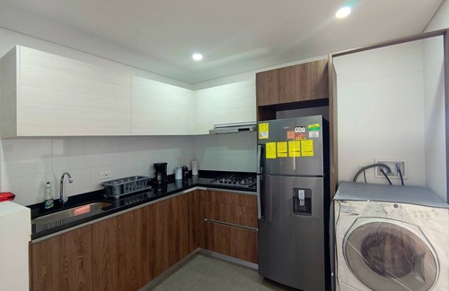 Enjoy the tranquility and comfort of this central loft in Cajicá, beautiful panoramic view, 5 floor, equipped kitchen, refrigerator, washer dryer, 50" TV, Netflix, WIFI- 350 MB, elevator, private covered parking. The building has a large terrace, Elevator, BBQ and 24-hour security. Located 6 blocks from the main Cajicá park and 2 blocks from public transportation, via Chía, Sabana Park, Centro Chía shopping center, Fontanar, La Sabana University and Bogotá north.