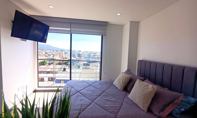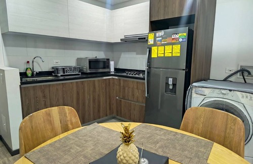 Studio apartment with large spaces, the main room has natural lighting, a beautiful view of Cajicá, a double bed, a large clothing closet, a private bathroom and a water heater. Living room with double sofa bed, dining room and a large fully equipped kitchen. Availability of private covered parking.