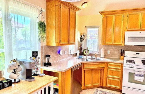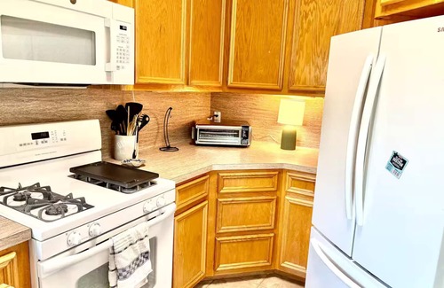 Fully stocked kitchen with toaster oven/air fryer combo, Keurig coffee maker, electric kettle, and mixer. Microwave, Gas range, fridge/freezer.