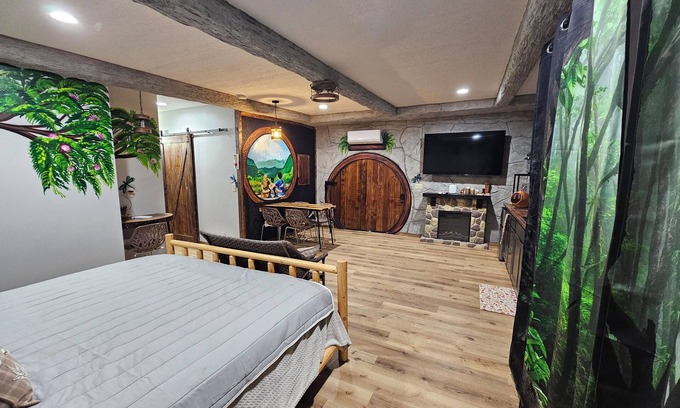 Restin' Holes is a Kentucky village on the Bourbon Trail. This Unit (A) is 1 of the 4 cozy, underground units on the property. This 572 sqft getaway features a king bed, Roku tvs, WiFi, fireplace, kitchenette, dining area, outdoor grill, desk, queen bunks room, washer/dryer, and walk-in shower bathroom. Many shared amenities including: swimspa hot tub, firepit/swings, sauna, gym, waterfall, painted murals, garden, fresh eggs, playground, & outdoor movies.