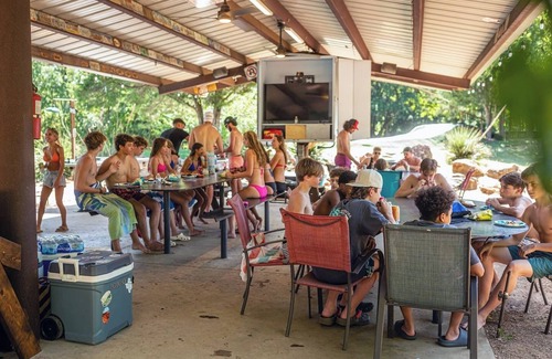 - Pavilion with grill, TV, and plenty of seating and tables.