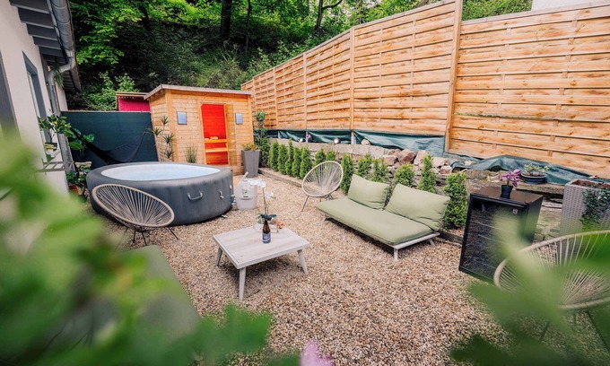 Vom Flur aus könnt ihr auch in unseren erholsamen Wellnessbereich im Hof hinter dem Haus gelangen. Die Sauna, der Whirlpool, die Außendusche und der Schwalleimer versprechen pure Entspannung.