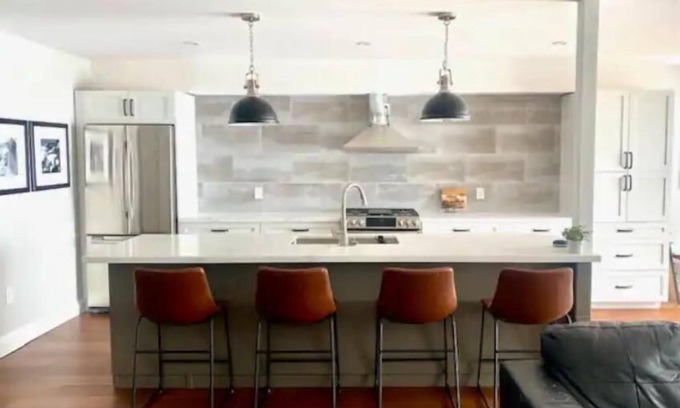 The chef's kitchen features a 9 foot island, gas grill, and ample seating for conversation and inclusion. The unique dining booth provides both a fun & quirky setting for meals; and also, a scenic lookout of the mountain.