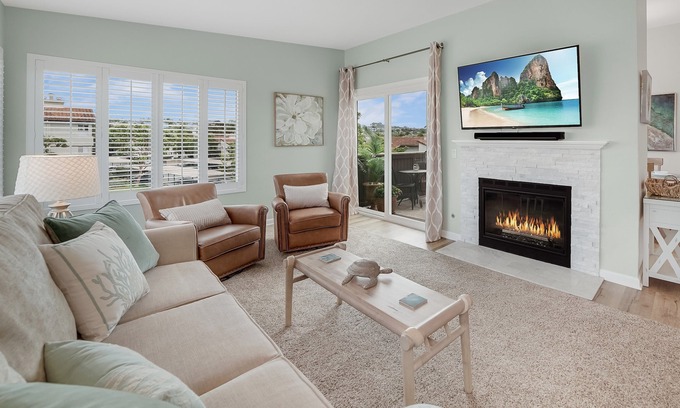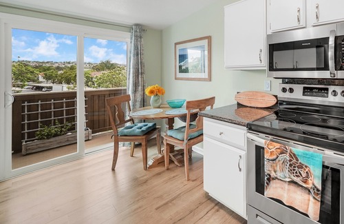 Located on the top floor - this beautiful and quiet condo is all one level once inside. Camera located outside front door for your added security. Front patio has peek-a-boo ocean views. It has everything you need for an enjoyable stay including free WIFI,