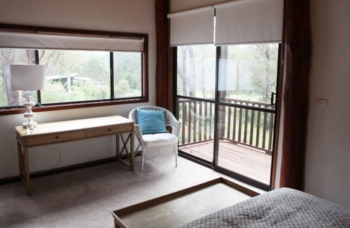 Bedrooms: Rivendell Lodge has five bedrooms and two bathrooms, with three toilets. Three bedrooms upstairs each have queen size beds, and large windows take in the breathtaking views of the natural bush setting. A balcony off the master bedroom overlooks the valley and down to the creek. Downstairs, the fourth bedroom has King bed and single bed, and the fifth bedroom has a queen bed and a single bed. The Lodge has gas hot water system, and both bathrooms are tastefully decorated. Home has laundry with washer and dryer. All bedrooms have split system airconditioning