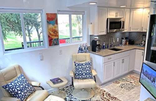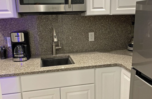 Nice kitchenette is equipped with cups, dishes, utensils, pots, electric tea kettle, electric skillet, etc., for cooking. Has built-in fold-down Breakfast nook table. Table seats 2 persons. Includes a small refrigerator and freezer, built-in microwave, granite counter tops, granite sink, blender, traditional coffee maker + a bagel toaster.