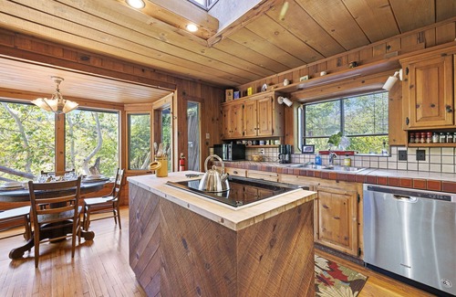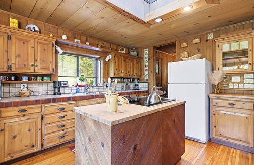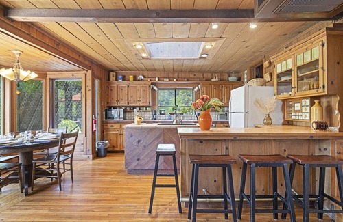 Outfitted with hand-crafted wooden cabinetry throughout, the living room features a large flat-screen television, Blue Ray player, stereo compatible with mobile devices and free WiFi. Cozy up to our stone fireplace, then pursue our selection of travel publications, novels, magazines and board games—the leather lounger, two recliners and comfortable couch invite you to enjoy! Should you be looking for adventure, white water rafting, hiking and the splendors of the Giant Forest are a short drive away. The Kaweah River Haus is an oasis of calm that our guests return to, again and again.