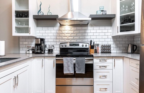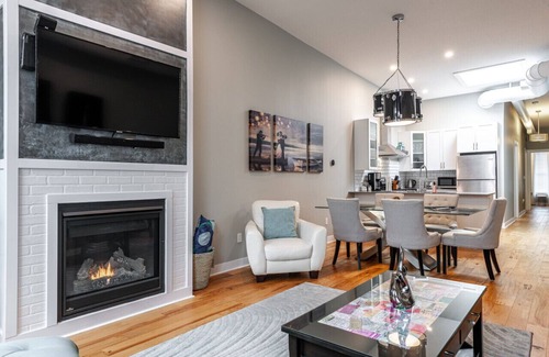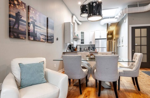 At the River Merchant Inn & Spa, your 1000 sq ft beautifully decorated and fully furnished private retreat is on the bank of the picturesque Avon River. This full size 2 bedroom apartment is a historical experience describing, with archive pictures and rare music memorabilia, the original uses of this unique downtown building beginning in 1909 as the Heintzman Pipe & Piano Company. Upon 2018 restoration, this building was the winner of the 2018 James D Anderson Heritage Restoration Award. After a day of walking just steps from your door to any of the 3 Stratford Festival Theatres, and many riverside and downtown activities, relax in the elegant Modern Musical Glam decorating by the fireplace, listening to a selection vintage vinyl on the record player, unwind in the deep soaker bathtub, or re-energize at the attached Illume Spa. Your Suite is located in the heart of Stratford’s beautiful, historic, tourist downtown with shops, outdoor cafes, restaurants, and activities. Other jewels in the crown of this one-of-a-kind Heintzman Music Suite are the picturesque views of the river and downtown core as well as the abundant light from the soaring 8’ windows. In addition, the new state of the art Chef’s kitchen is fully equipped with all appliances, dinner service and cookware, essentials like spices, coffee and tea’s, and is ready for the fresh ingredients you can find at the weekend Farmer’s Market in the downtown square. Free in-suite laundry is provided for your convenience. It is the perfect getaway for families, friends, couples, or business.