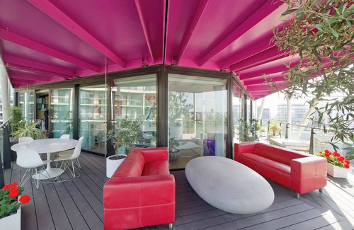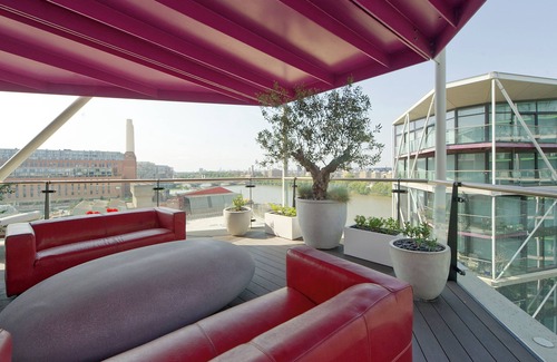 Step outside and experience the very best of riverview living. The terrace wraps around the entire apartment and features a bold red colour scheme: the overhang and the two sofas are striking in crimson, punctuated by a large pebble coffee table and large potted plants. Further along is an outdoor table for four to six, where you can watch riverboats go past Battersea Power Station towards the west.