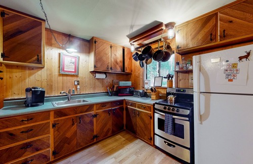 Boasting rustic features, gorgeous stained glass windows, and comfortable indoor and outdoor spaces, this home has it all! Brew up your morning coffee or prepare epic feasts in the well-equipped, eat-in kitchen. The addition of a seasonal gas grill lets you spice up your home-cooked menu in the spring and summer months. After meals or thrilling days out, settle into the living area, get a fire roaring in the wood stove, and then stream your favorite channels into the evening.