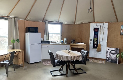 Inside, you’ll find a cozy queen bed with a premium Yogabed mattress, and a beautiful detached bathroom with a full shower and tub. Whether you're here to relax, recharge, or reconnect with nature, this peaceful studio yurt offers the ultimate getaway.