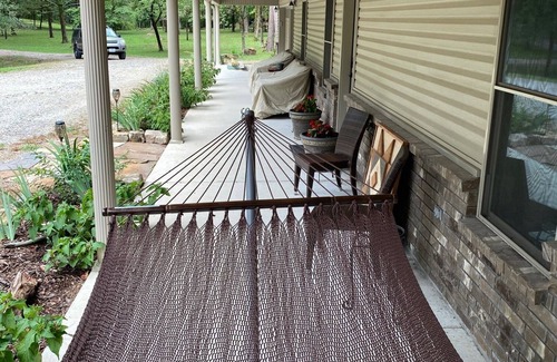 Sip your morning beverage on the front covered patio w/ padded outdoor furniture or 10ft hammock as the squirrels forage and fog rolls through the valley. Explore the grounds for white and rose quartz gemstones as you walk a serene grassy trail through the densely shaded forest. Watch a sunrise or sunset from the stunning slate bluff lookout point where you can see the river and horizon for miles in three directions South, East and West.
