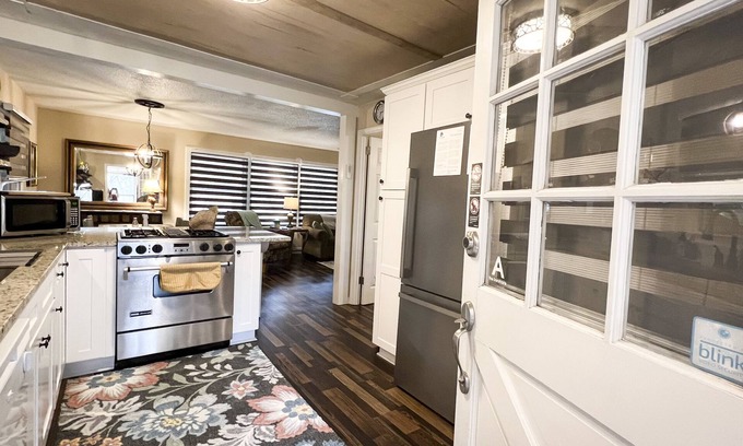 1 bd/1 ba, furnished apartment near Amerson River Park with a full kitchen. This living space has been completely remodeled with an open concept layout with a touch of modern, rustic, farm, and eclectic design all rolled into one for a very unique look. Enjoy new flooring, lighting, 18,000 BTU floor heat pump mini split, and zebra blinds. Convenient in-unit washer/dryer combo & small additional dryer. Monthly discounts applied automatically when you enter your dates.