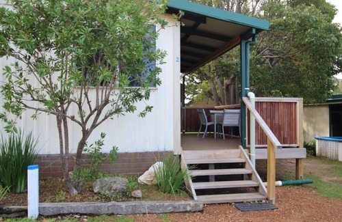 The grounds of Riverscape offer that good old-fashioned holiday feel, with a lawn area and shady peppy trees.