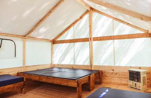 Enjoy the tranquil sound of flowing water at our Riverside Trapper's Tents. Inside, find wooden floors and wood-frame beds with vinyl-sealed foam mattresses, a small kerosene heater and lantern (fuel provided), and pet-friendly accommodations. Bring your own bedding or rent from us. We recommend pre booking to guarantee bedding upon arrival.. Outside, cook over the fire pit with half-grill or relax at the picnic table. Our Riverside Trapper's Tents sleep four with one double bed and two single beds, and are just steps away from the river.