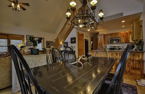 Inside, you'll love all the modern conveniences with a fully equipped kitchen, a spacious great room with 50" Smart TV and a wood burning fireplace for those chilly mountain evenings. The king master is located on the main level with a 32" Smart TV and the upper level offers 2 more queen bedrooms. The kids will absolutely love the "Kid's Kave" downstairs with their own 32" Smart TV and pyramid bunk bed.