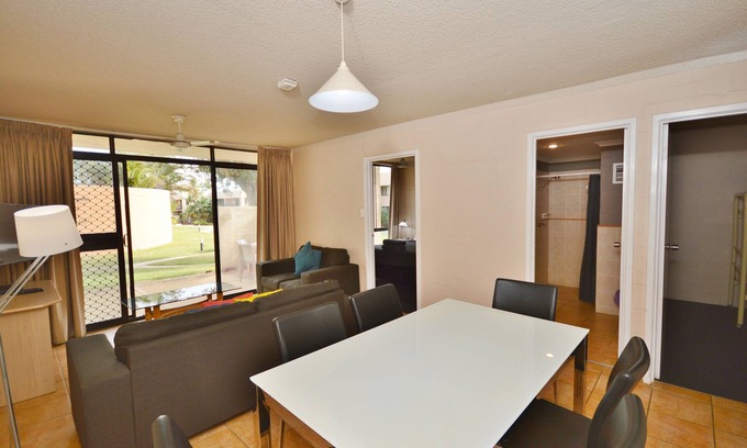 Ground floor 2 bedroom 1 bathroom Apartment, main bedroom has 1 x queen bed, second bedroom has 1 x bunk bed and 1 x single bed. Reverse cycle split system air conditioner and ceiling fan in main living area. TV, DVD player, The Kitchen has a stove, oven, microwave and fridge/freezer (No washing machine) The complex has a laundry, swimming pool, BBQs, and tennis courts please note you do need to bring your own Racquets and balls. This Apartment is Privately Owned.