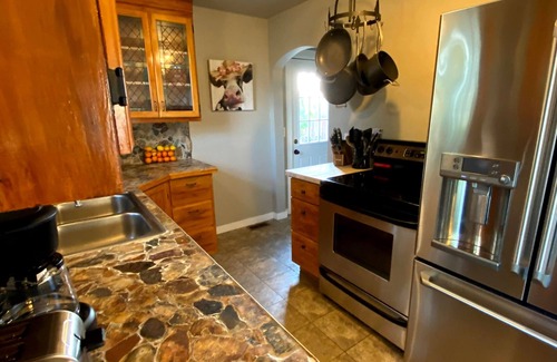 Continue your exploration of our renovated space but keep an eye out for the carefully preserved gems of the past. Built-ins, coved ceilings and a handmade agate countertop and backsplash will give you a taste of yesteryear while the central air, fully stocked kitchen and screaming fast wi-fi will remind you how glorious it is to live in the now.