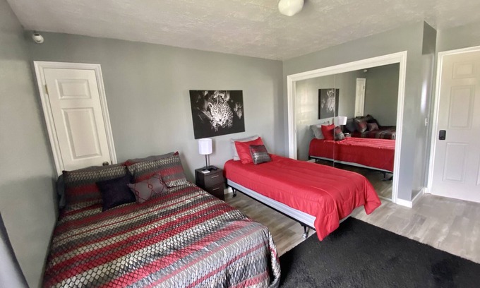 One double bed and one single bed in a private room. Keyless entry to room. There is a shared kitchen, dining and living room on the second floor. There is a tv in the room along with a big closet. There is a big patio outside side and lots of parking in front of the house. There is a shared bathroom with one other room.