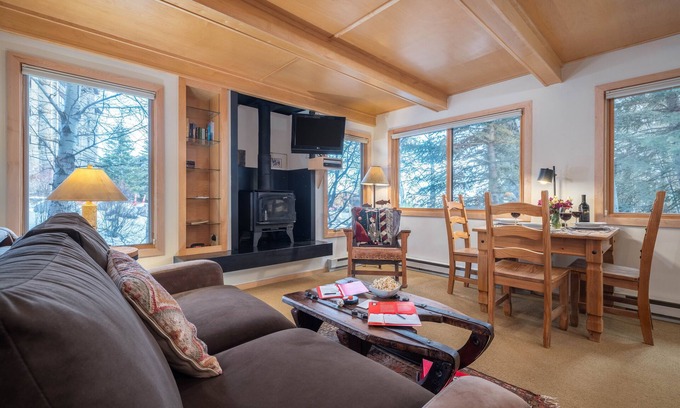 Location, location, location! Within easy walking distance to all the shops and restaurants in Teton Village as well as the Tram and Gondolas. This cozy, ground floor condo offers a small queen bedroom with a full attached bath. You'll enjoy a fully equipped kitchen with stainless steel appliances and a granite top breakfast bar. The living room includes a queen sofa sleeper, LCDTV and small dining table. A community washer/dryer is available in the building. You need to walk pass unit #2 and to the right there is a closet door with a keypad that requires a code to enter in. These properties have a small wood stove making them very cozy.