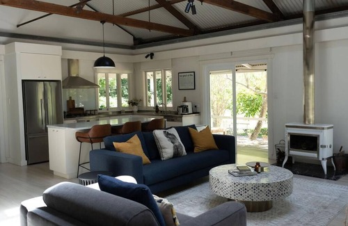 Rock Davis Beachouse was formerly St Anthony's Catholic Church. Masterfully transformed into a modern holiday house, blending beachside charm with a contemporary industrial edge and clean fluid lines, highlights include the covered wraparound verandah, spectacular vaulted ceilings, original exposed timber beams, and outdoor hot tub.