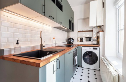 Designed to combine comfort and practicality, the apartment features a separate fully equipped kitchen (oven, microwave, dishwasher), a bright living room with a relaxation area and board games, as well as a dedicated workspace with fiber optic Wi-Fi, perfect for remote working. A washing machine is also available – a real advantage for longer stays.