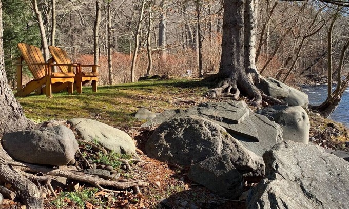 - Backyard: A grassy area with Adirondack chairs, a fire pit, and supplied firewood. Relax to the soothing sounds of the Esopus Creek nearby.